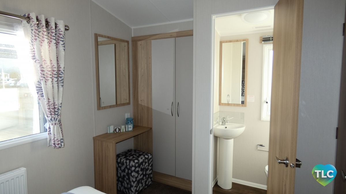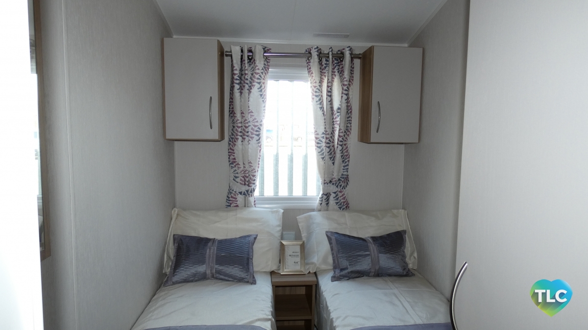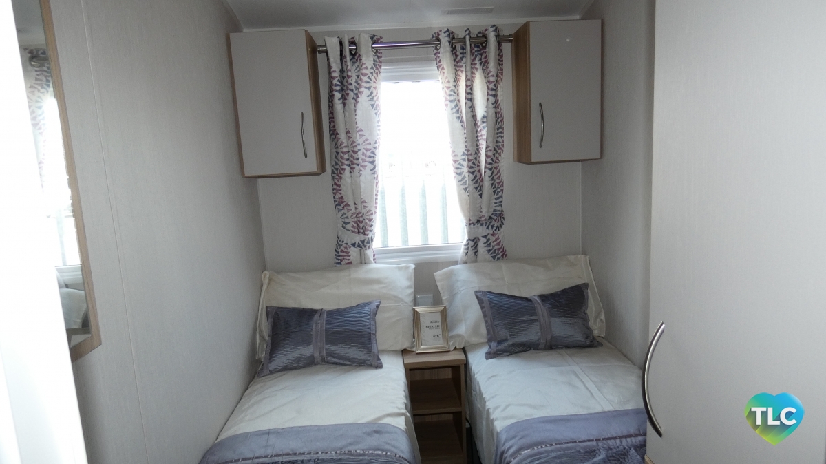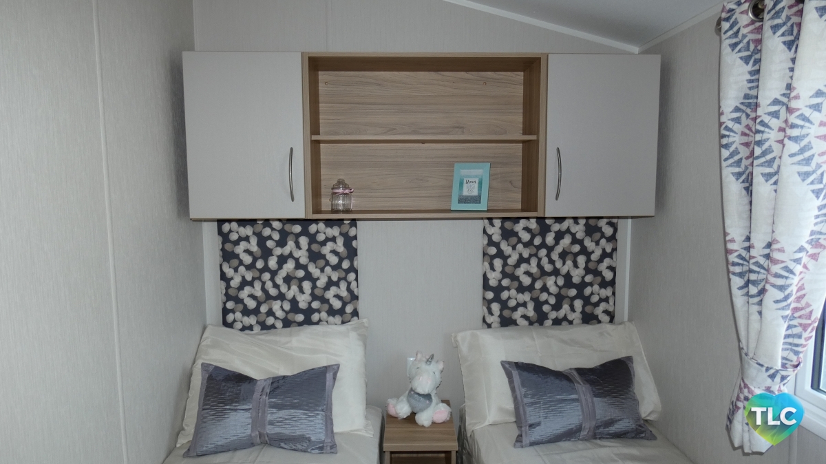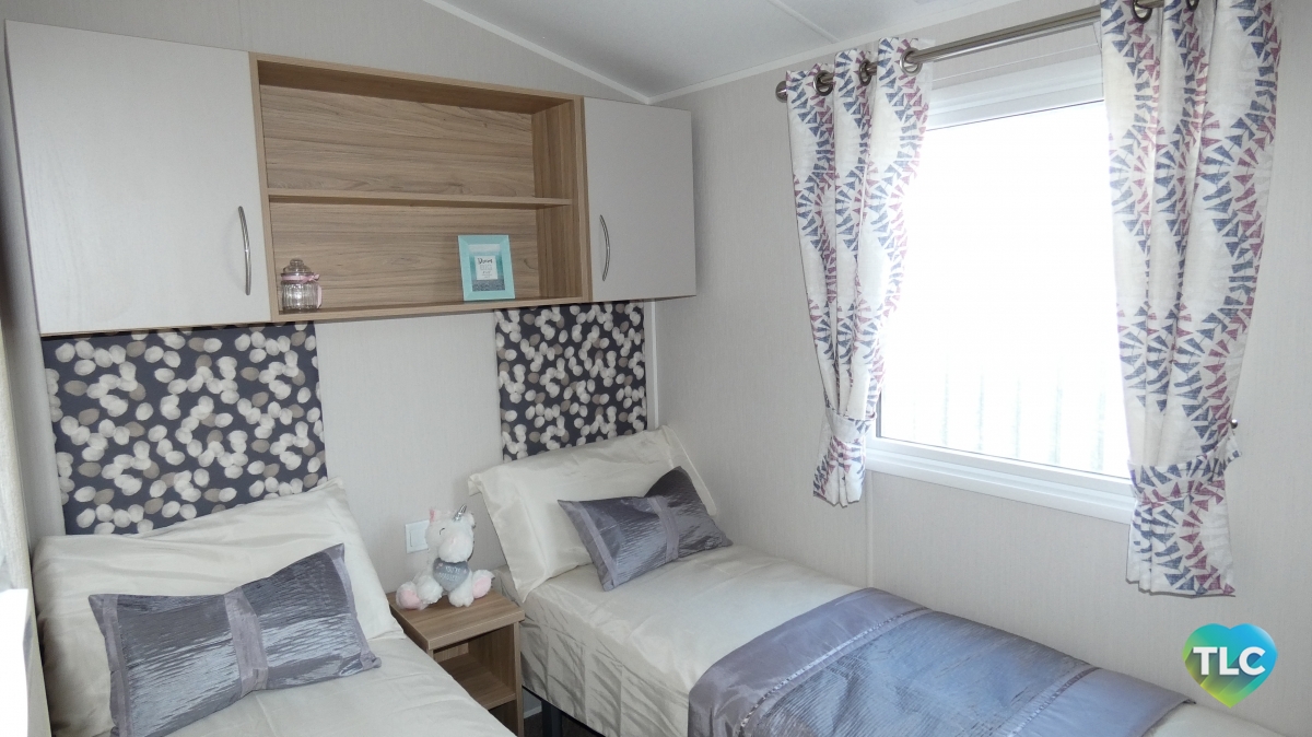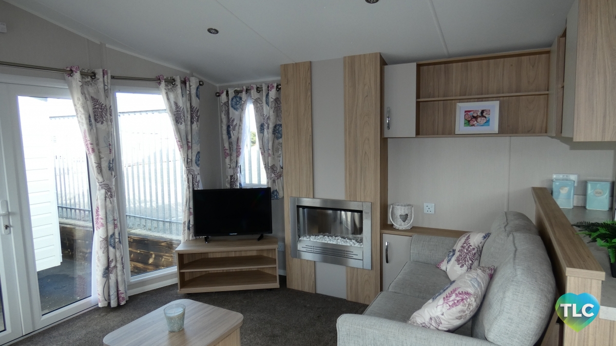 The lounge layout makes great use of the space, and gives the illusion of free standing furniture, with a two seater and four seater fixed sofa’s in a neutral colour. The curtain furnishings are in a stylish cream and has a floral pattern with subtle tones of raspberry and petrol blue. With the benefit of the full height windows, which bring natural light into this area. Pinewood colours woodwork follows through the whole holiday home, creating a natural flow between all rooms.