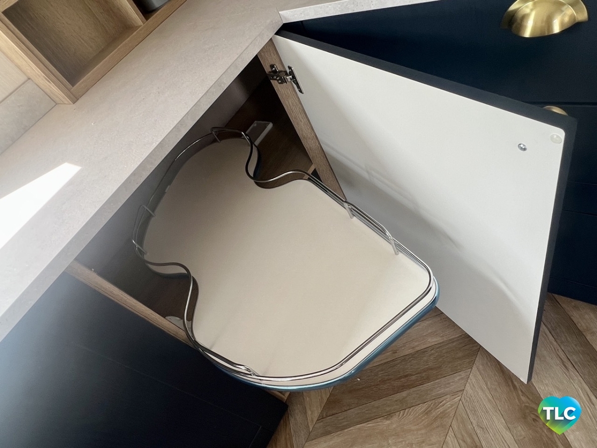 The kitchen steals the spotlight here, designed in a bold mix of dark blue and gold with glazed cabinets that add a sleek, modern edge. Every inch is maximized with features like swivel-out corner shelving, a pull-out storage rack, and an integrated fridge-freezer, plus deep drawers beneath the hob for all your cooking essentials. This kitchen doesn’t just store more – it redefines how spacious and organized a holiday home kitchen can be. Paired with high-end appliances and ample workspace, it's arguably one of the best kitchens in any holiday home!